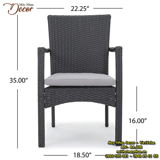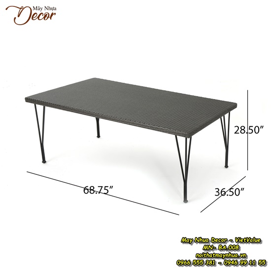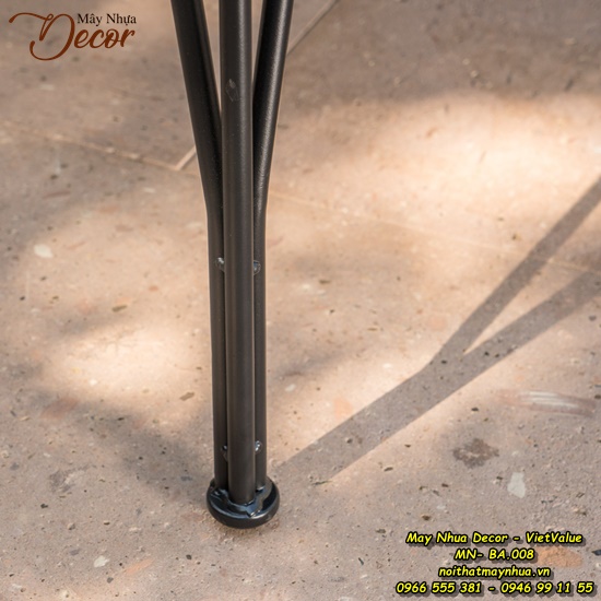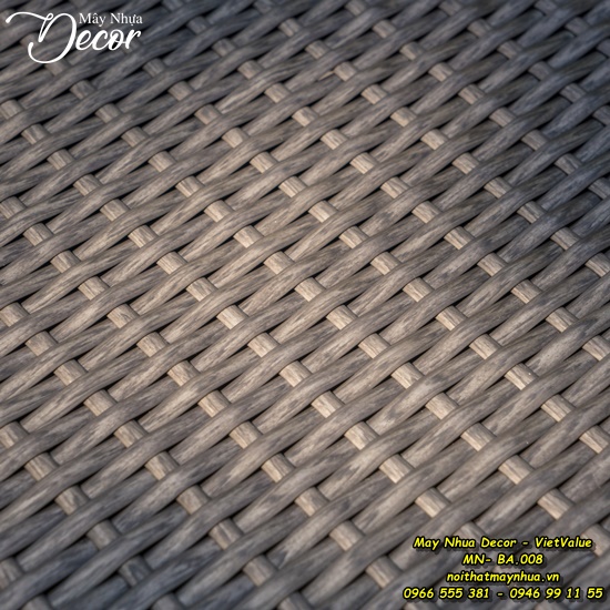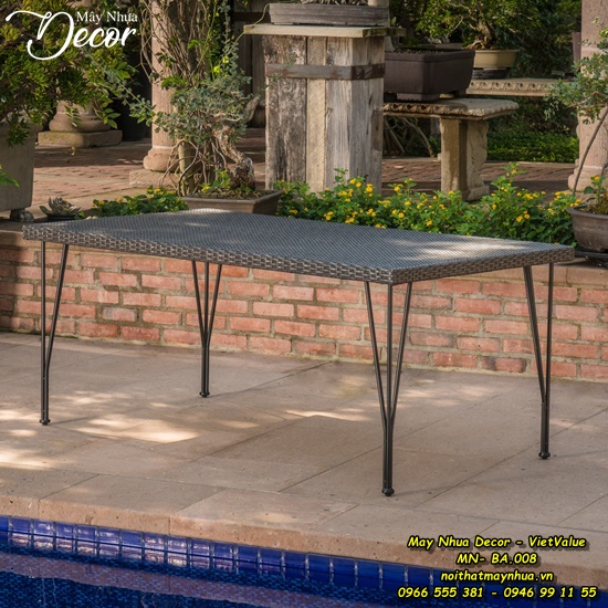 Khung được làm từ sắt sơn tĩnh điện và bọc ngoài là lớp mây nhựa tổng hợp đan tay thủ công chống tia cực tím, chống nước nên rất phù hợp với không gian sân vườn, bể bơi, resort... . Bộ bàn ăn này có thể thách thức mọi điều kiện thời tiết, rất bền và có thể để ngoài trời quanh năm và dễ dàng làm sạch bằng nước hoặc xà phòng.