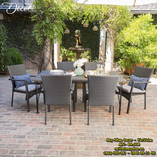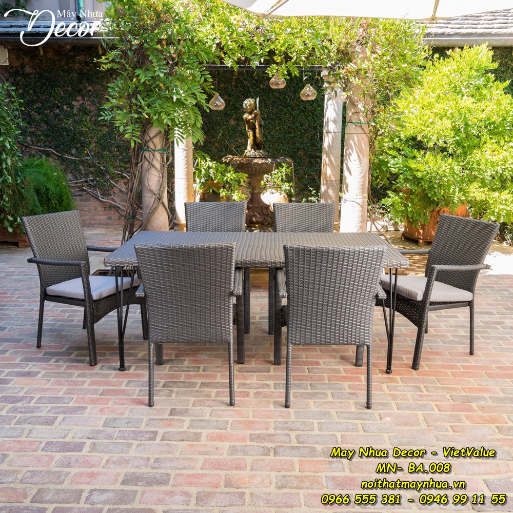 Hãy tận hưởng những cơn gió mát, ánh nắng ấm áp, thưởng thức bữa tối ngoài trời với bộ bàn ăn MNB-BA-008 được thiết kế đơn giản, thanh lịch như thể dành riêng cho không gian sân vườn nhà bạn.
