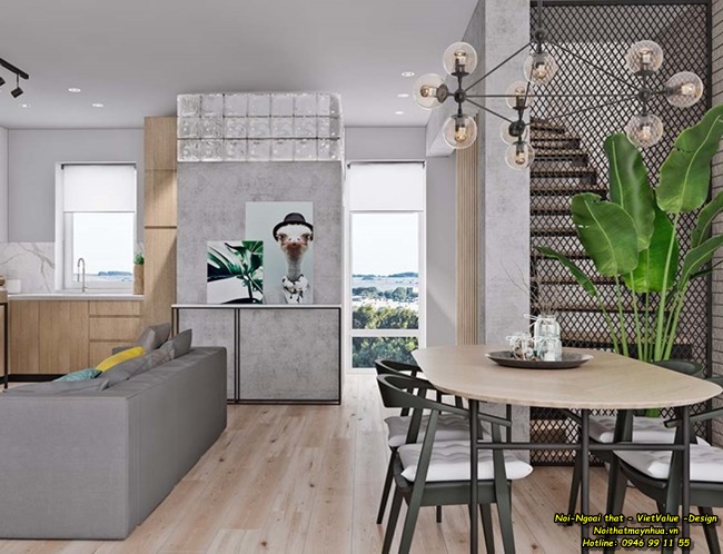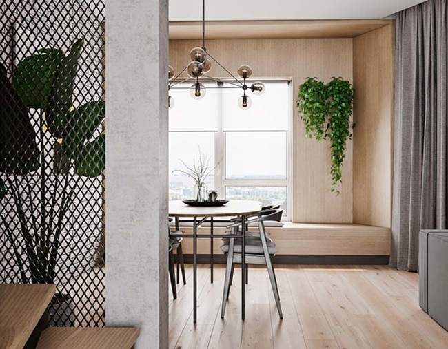 Bàn ăn có cùng màu sắc với sàn gỗ, trong khi ghế có màu tối hơn phù hợp với chủ đề “trang trí trung tính” mà nhà thiết kế đã đặt ra ngay từ đầu