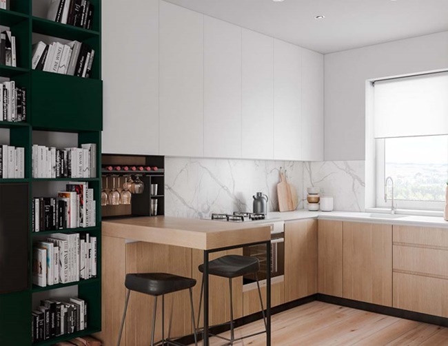 Khi vừa đặt chân vào bạn sẽ cảm nhận ngay căn hộ này có cách bố trí hoàn toàn khác so với những ngôi nhà khác, thay vì nhà bếp sẽ đặt sau ghế sofa thì ở đây bếp lại đặt trước.
