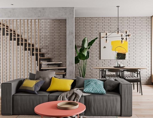 Màu vàng, cam, xanh được nhấn mạnh trên nền tông màu trung tính.