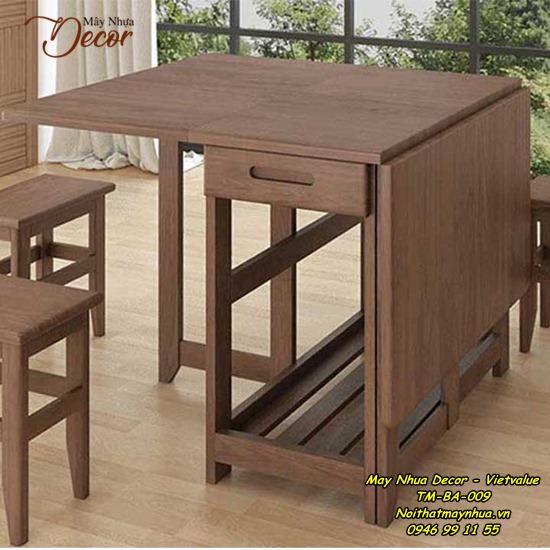 Thiết kế vô cùng thông minh của bộ bàn ăn TM - BA - 002 có thể phù hợp với mọi không gian. Sản phẩm được thiết kế kết hợp với ghế đẩu nhỏ giúp căn phòng trở nên rộng rãi, thông thoáng hơn. Bộ bàn và ghế sử dụng chất liệu gỗ tự nhiên tạo cảm giác ấm cúng cho bữa cơm gia đình. Bạn có thể gập bớt một cánh bàn khi có ít người cùng ngồi ăn hoặc mở rộng hết 3 phần mỗi khi gia đình có khách.