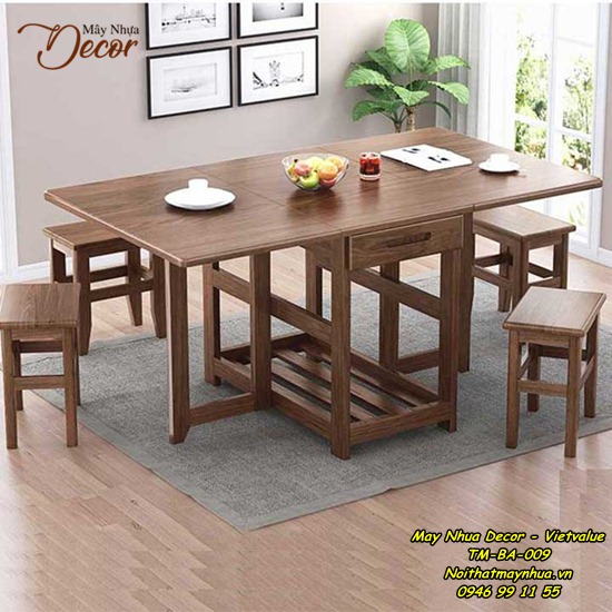 Rất nhiều gia đình yêu thích bộ bàn ghế ăn thông minh vì những tiện ích mà nó mang lại. Khi cần thiết, người sử dụng có thể mở ra tạo nên một bàn ăn có kích thước đủ dùng cho cả gia đình quây quần trong một bữa cơm sum họp. Khi không sử dụng, chỉ cần xếp gọn để tiết kiệm được không gian sống đáng kể.