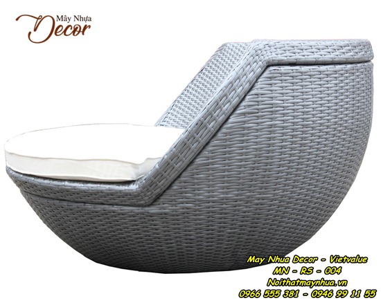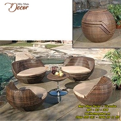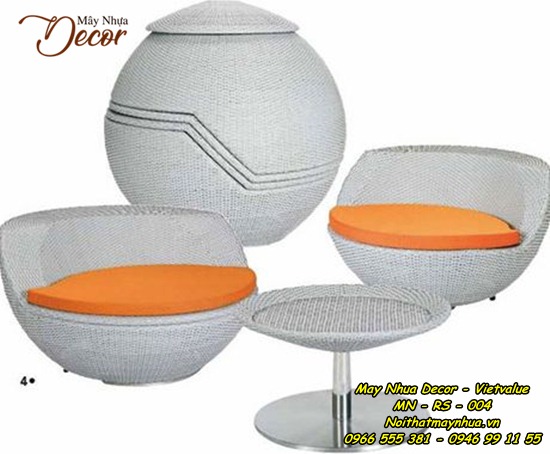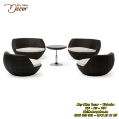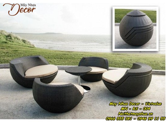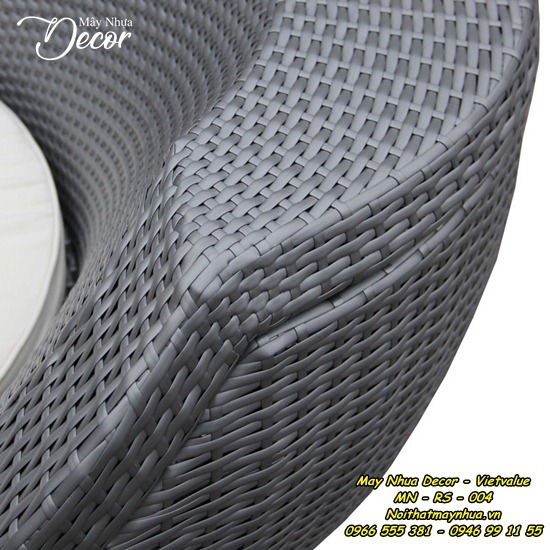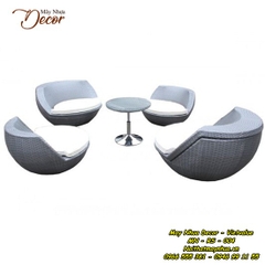 Bộ sofa ngoài trời MN - RS - 004 thể hiện một phong cách sáng tạo, thiết kế thông minh bằng sợi nhựa giả mây đan thủ công trên nền khung sắt sơn tĩnh điện không gỉ thích hợp với mọi thời tiết nên rất bền kết hợp với đệm ghế sáng màu mang lại cảm giác thoải mái.
