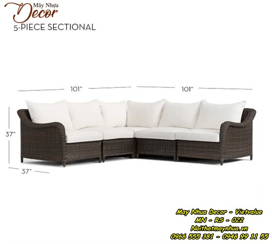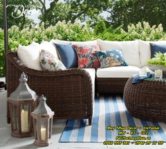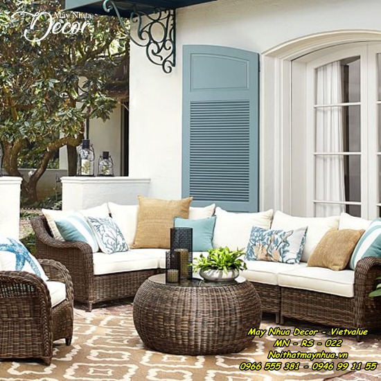 Bộ sofa RS 022 được đan tay thủ công từ sợi nhựa giả mây màu sắc đa dạng, phù hợp với mọi điều kiện thời tiết nên có thể để ở ngoài trời quanh năm mà không cần bảo trì.