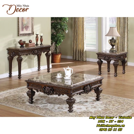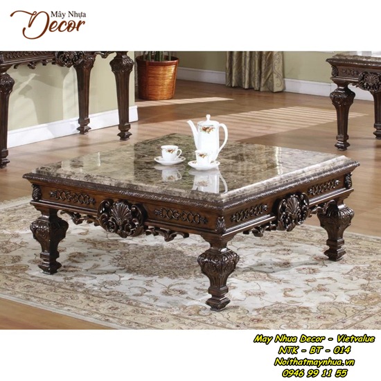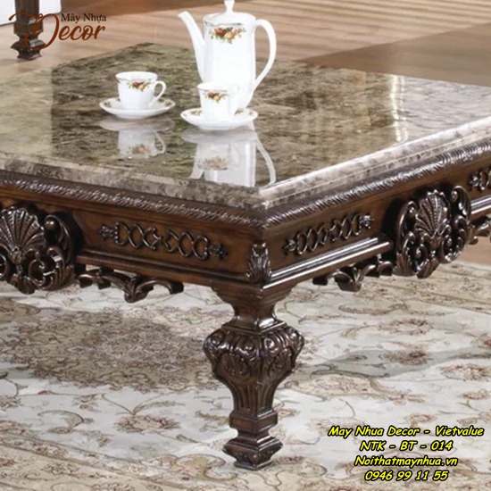 Điểm đặc biệt của mẫu bàn trà này đó chính là mặt bàn bằng đá cẩm thạch có vân rất đẹp. Form bàn hình vuông, phần bàn trà được khắc tinh xảo với những họa tiết mềm mại. Nổi bật nhất là 4 chân bàn với kiểu dáng cực kỳ sang trọng, được chạm khắc sắc nét tinh tế tạo nên một sản phẩm lịch lãm, sang trọng mang đậm phong cách Châu Âu.