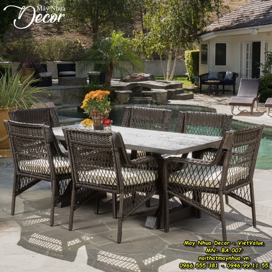 Thưởng thức bữa tối ngoài trời với bộ bàn ăn MN-BA-007 được thiết kế thoáng, mộc mạc, gần gũi với thiên nhiên như thể dành riêng cho không gian sân vườn nhà bạn.