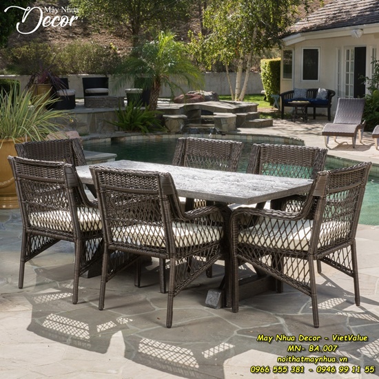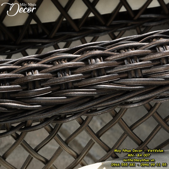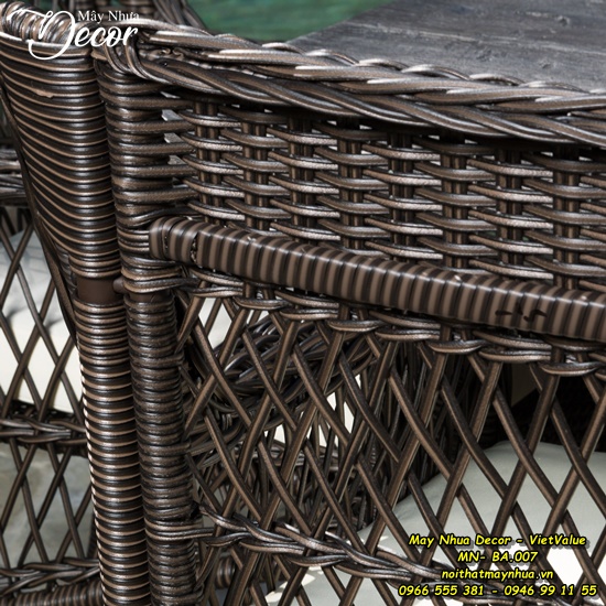 Bộ sản phẩm được làm từ khung sắt sơn tĩnh điện với lớp bọc ngoài là sợi mây nhựa tổng hợp đan tay thủ công tỉ mỉ không những bền mà còn rất đẹp mắt. Dù là tiếp khách hay chỉ đơn giản là thưởng thức bữa tối ngoài trời thì chắc chắn bộ bàn ăn MN-BA-007 sẽ luôn làm bạn hài lòng.