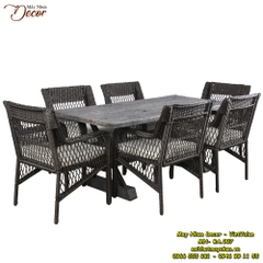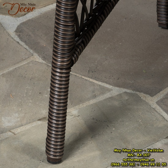 Do Khung của bộ bàn ghế này được làm từ sắt sơn tĩnh điện, chống rỉ, lớp bọc bên ngoài là sợi mây nhựa tổng hợp nhập khẩu được các thợ lành nghề đan thủ công bằng tay. Nên bộ bàn ăn này có thể thách thức mọi điều kiện thời tiết, rất bền và có thể để ngoài trời quanh năm và dễ dàng làm sạch bằng nước hoặc xà bông.
