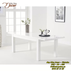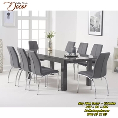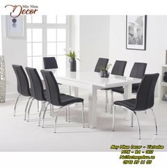 Bộ bàn ăn này tươi sáng có độ bóng cao, Chiều dài 160cm cho chỗ ngồi cho tối đa 6 thực khách. được thiết kế linh hoạt có hai bảng ẩn mở rộng để cung cấp chiều dài lớn hơn 220cm cho chỗ ngồi 10 thực khách . Kết hợp với 8 ghế với ghế bọc PU bóng , lưng ghế cao, chân ghế mạ crôm sáng bóng