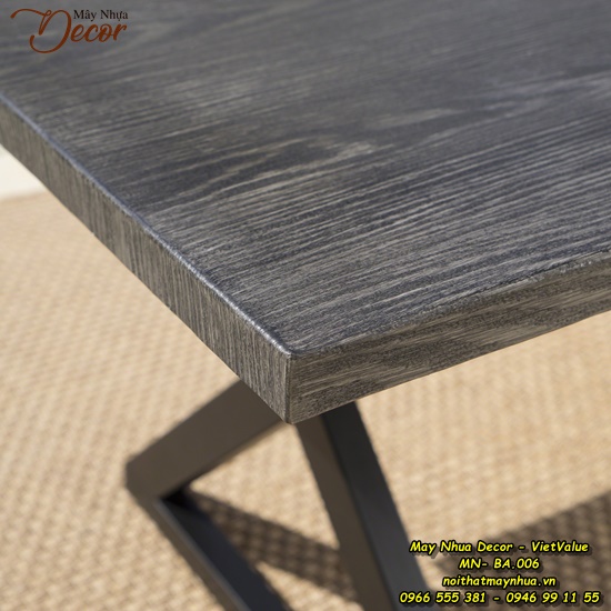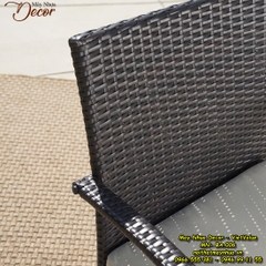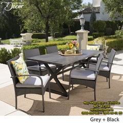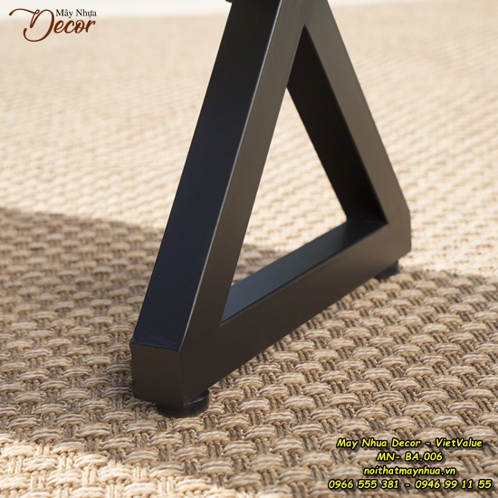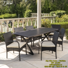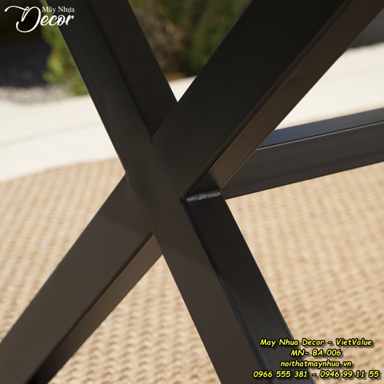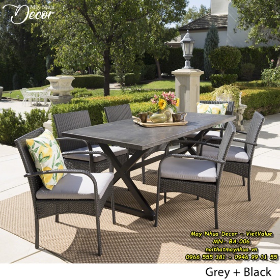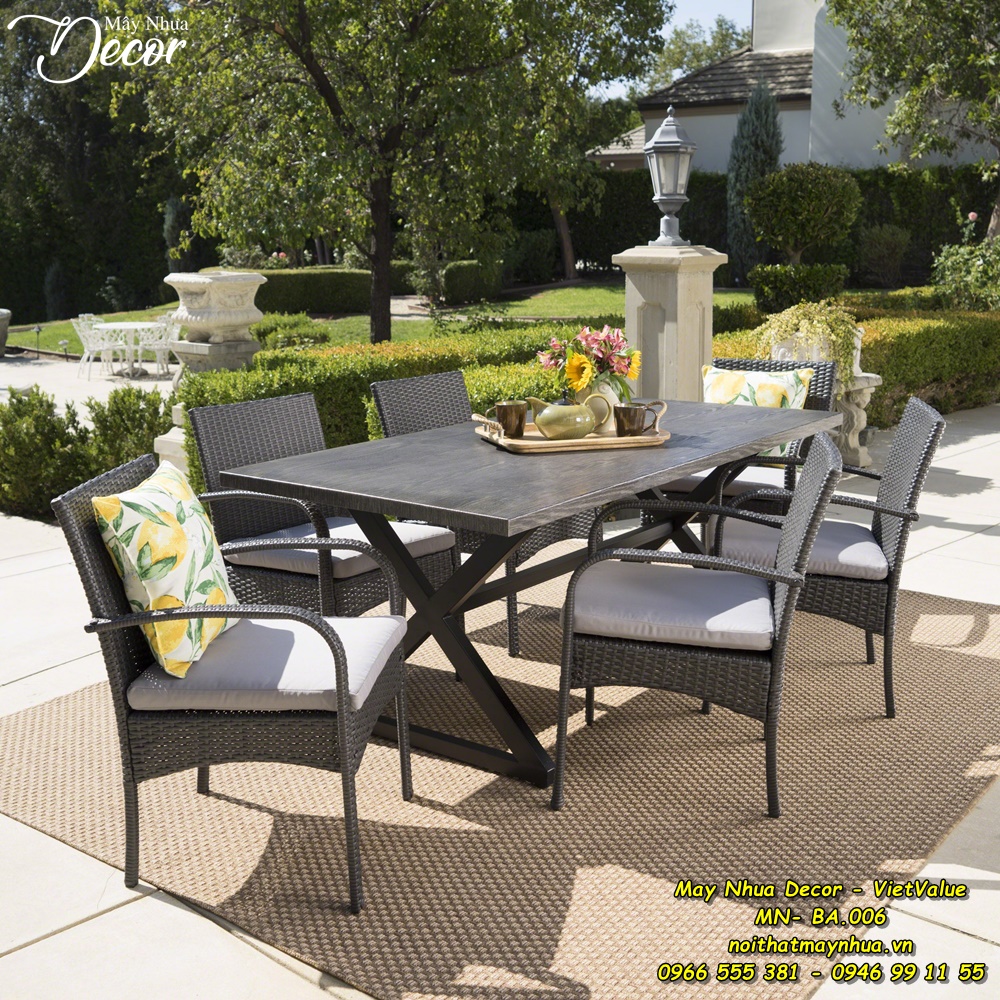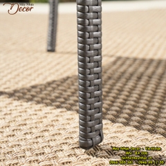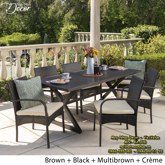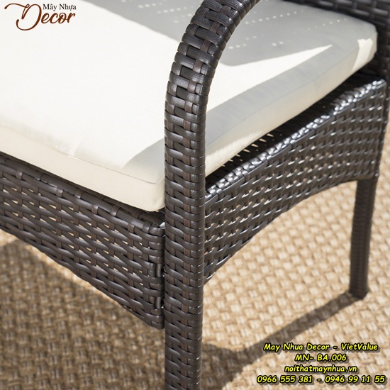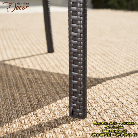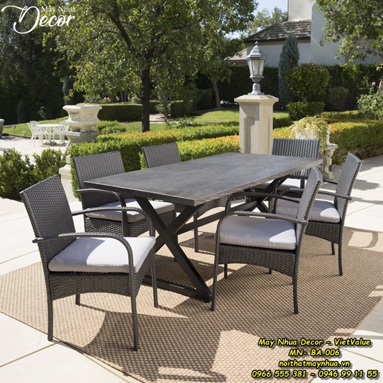 Khung được làm từ sắt sơn tĩnh điện và bọc ngoài là lớp mây nhựa tổng hợp đan tay thủ công chống tia cực tím, chống nước nên rất phù hợp với không gian sân vườn, bể bơi, resort... . Bộ bàn ăn này có thể thách thức mọi điều kiện thời tiết, rất bền và có thể để ngoài trời quanh năm và dễ dàng làm sạch bằng nước hoặc xà phòng.