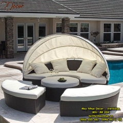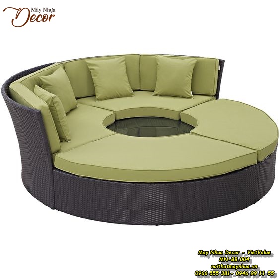 - Thiết kế theo hình tròn, bán nguyệt, các modun có thể tháo rời, tùy chỉnh theo góc độ, vị trí , chuyển được thành bàn - ghế độc lập -được bọc và đan bằng sợi Mây nhựa cao cấp.