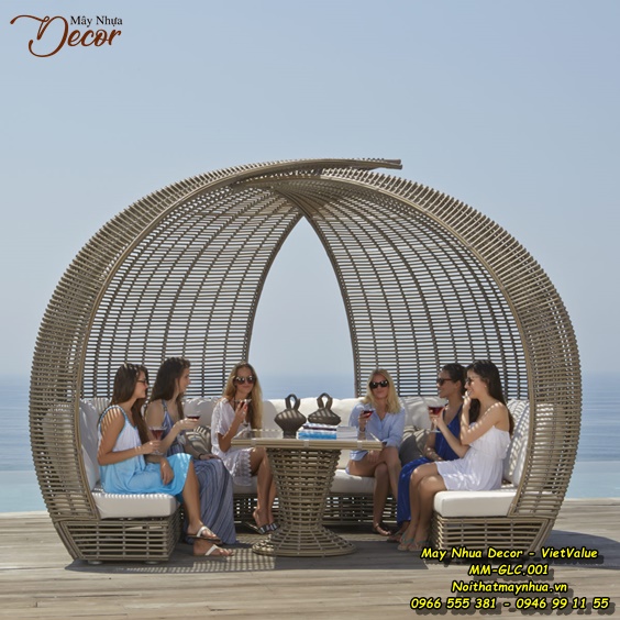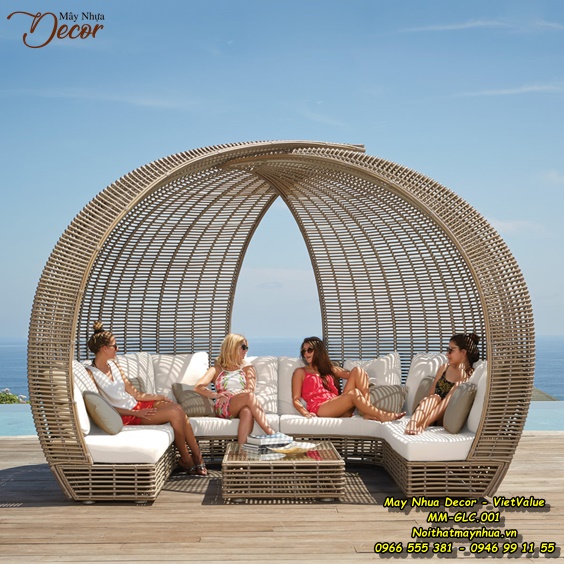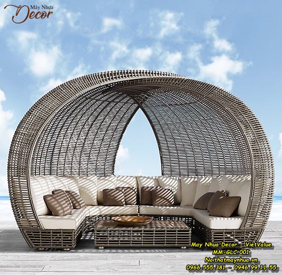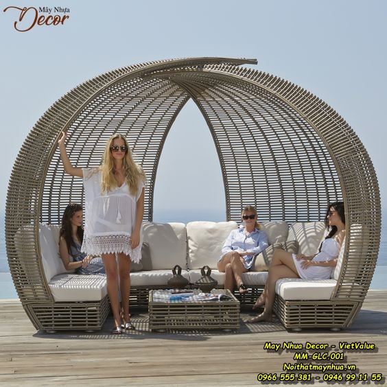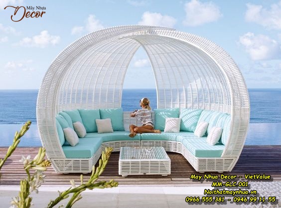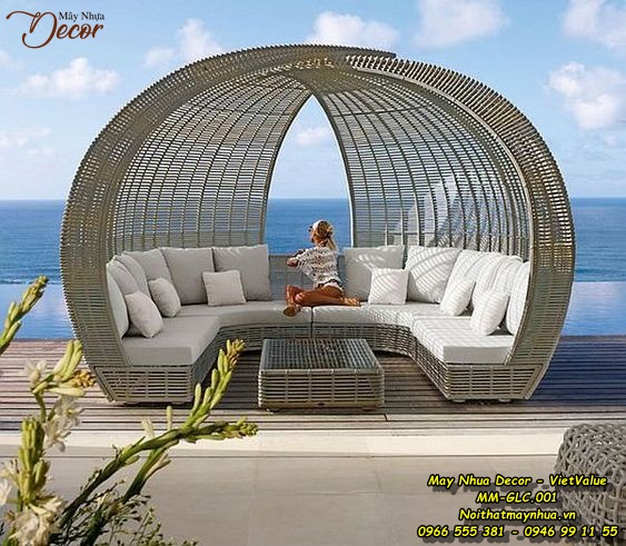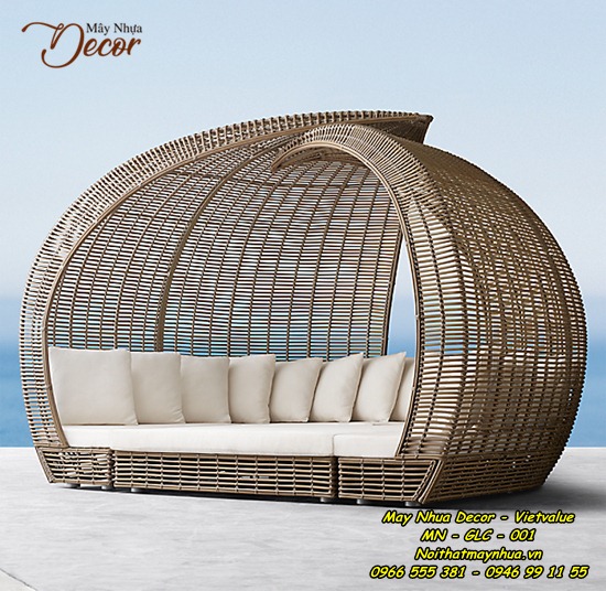 Bộ sản phẩm MN-GLC-001 được thiết kế theo hình mặt trăng lưỡi liềm chồng lên nhau tạo thành một chiếc sofa hoặc một chiếc giường có mái che thích hợp cho việc nằm phơi nắng hay thư giãn ngoài trời.