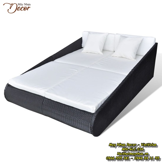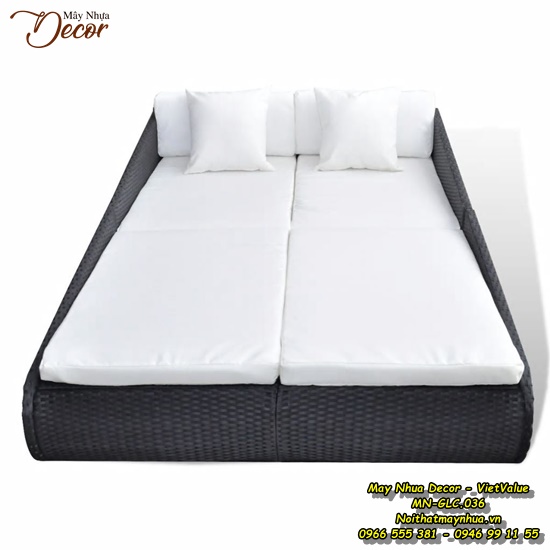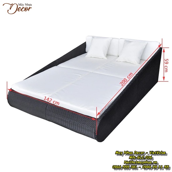 Bộ giường ngoài trời được làm bằng sợi mây tổng hợp đan tay thủ công và khung sắt sơn tĩnh điện không gỉ thích hợp với mọi điều kiện thời tiết.
