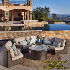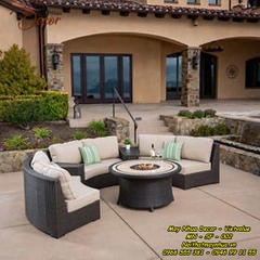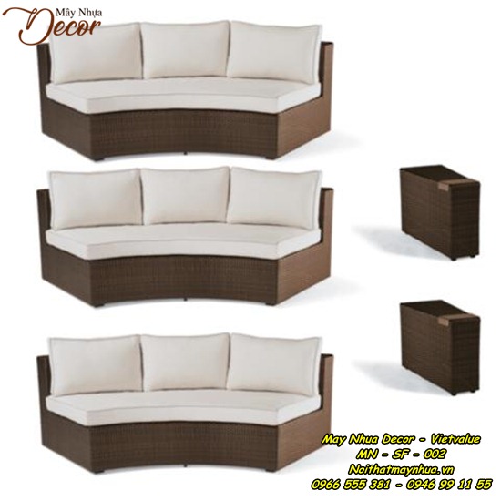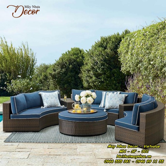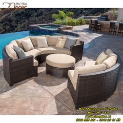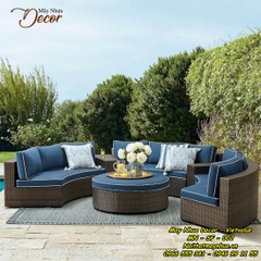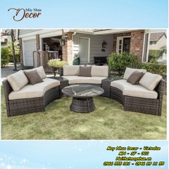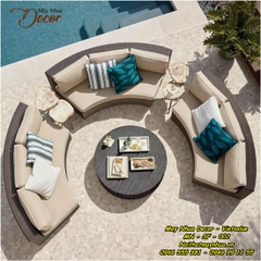 Bộ sofa này được đan từ sợi nhựa giả mây chất lượng cao trên khung nhôm sơn tĩnh điện kết hợp với đệm có đáy lưới nên rất thoáng và nhanh khô. Bộ sofa đệm hình tròn gồm 2 bàn góc và 1 bàn tròn tạo bầu không khí trò chuyện ngoài trời vô cùng tuyệt vời.