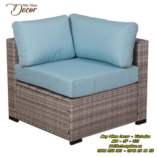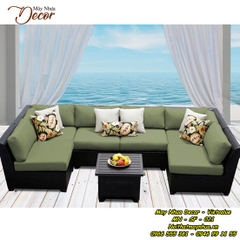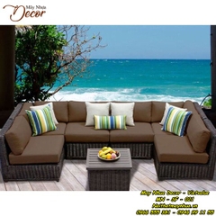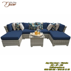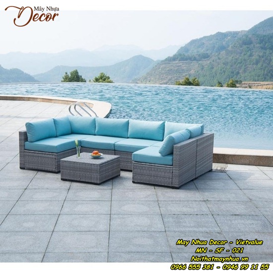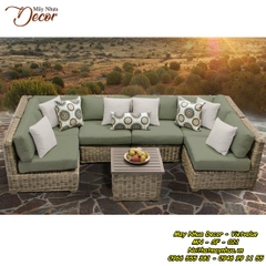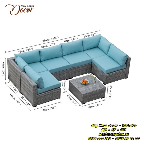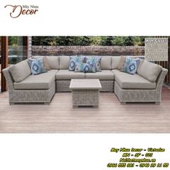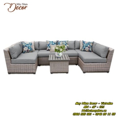 Bộ sản phẩm gồm 6 ghế sofa và 1 bàn trà nên rất dễ dàng sắp xếp cho phù hợp với không gian và nhu cầu sử dụng của bạn. Bộ sofa được dựng bằng khung sắt tĩnh điện kết hợp đan tay thủ công sợi mây nhựa màu xám, điểm thêm vở đệm màu sáng tạo cảm giác thư giãn thoải mái. Bàn trà cũng được đan bằng mây nhựa thay bằng kính rất an toàn cho những gia đình có trẻ nhỏ.