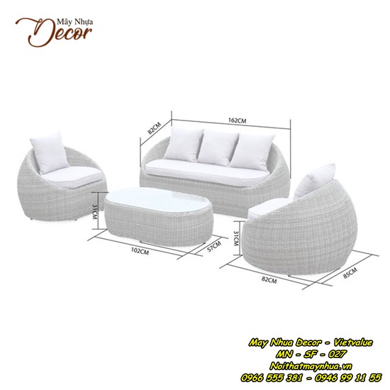 Bộ sofa 4 chỗ ngồi được làm từ sợi nhựa tổng hợp giả mây có độ bền cao, khung của bộ sofa được làm từ vật liệu sắt sơn tĩnh điện không gỉ phù hợp với mọi thời tiết nên có thể kê ở trong nhà hoặc ngoài trời. Đây là bộ sản phẩm được thiết kế theo phong cách truyền thống, sang trọng và độc đáo.