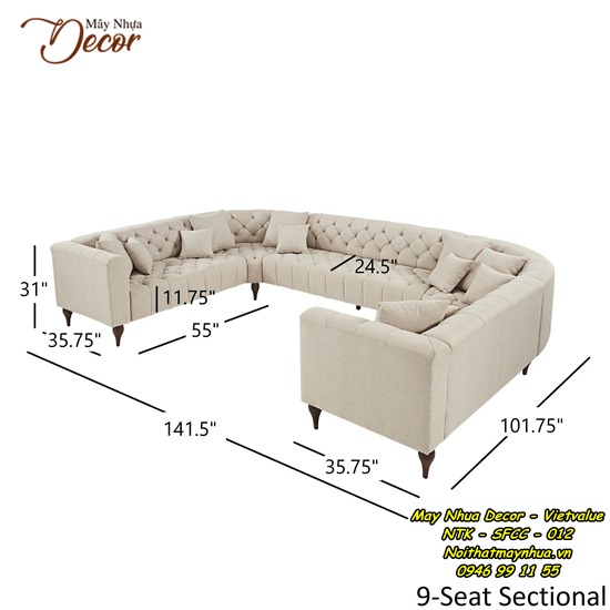 Kích thước tổng thể : Rộng 141,5” x Sâu 116,8” x Cao 31” (Rộng 359cm x Sâu 297cm x Cao 79cm)